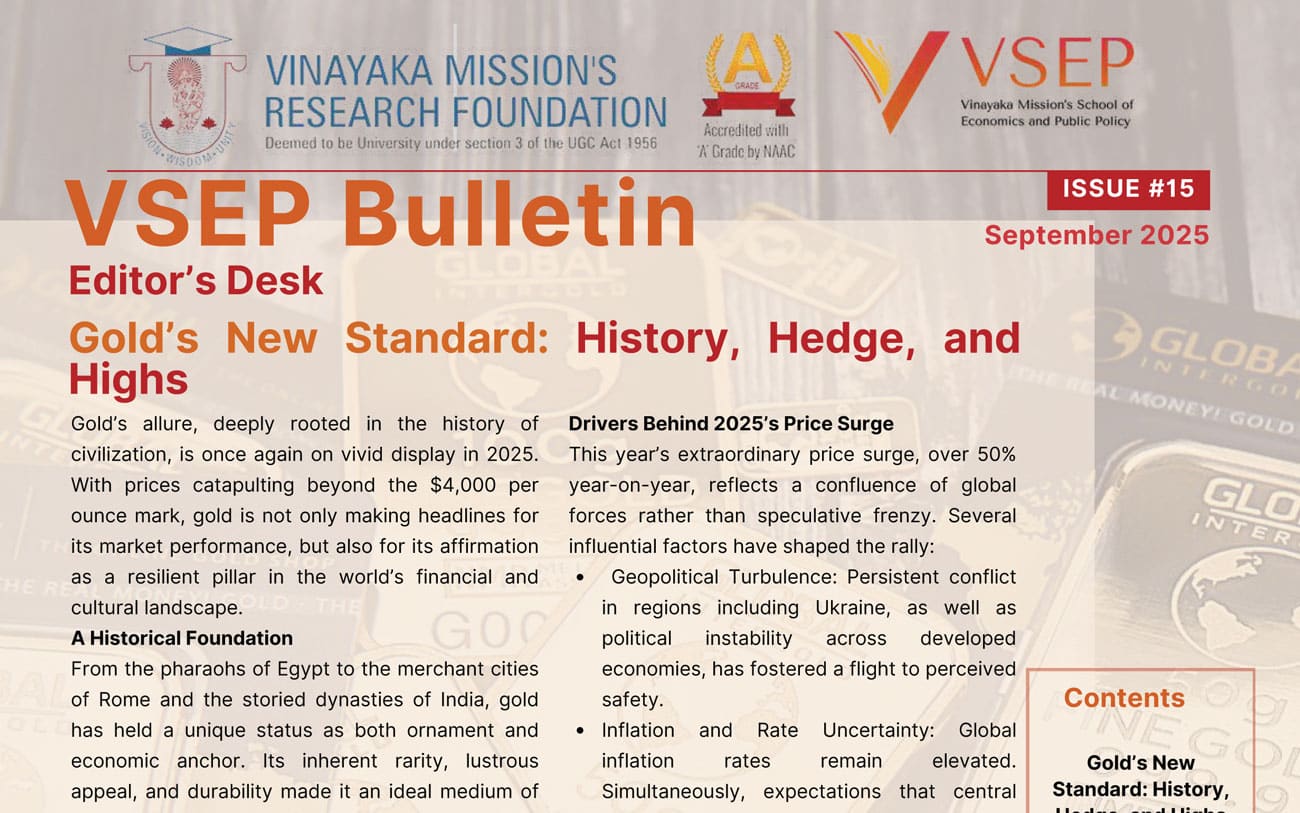 The primary objective of Vinayaka Mission’s School of Economics & Public Policy (VSEP) is to cultivate upcoming economists, social leaders, and thought leaders equipped with the capacity to address dynamic socio-economic challenges by promoting inclusivity at the local, national and global levels.